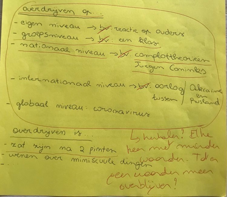 Het thema wat ik opgaf als startpunt: ‘overdreven/overdrijven’. Wat vind je overdreven in de wereld om je heen? Welke mensen overdrijven? Reageer je zelf op situaties die je overdreven vindt? Hoe? Reageer je niet? Waarom niet? Wanneer overdrijf je zelf?