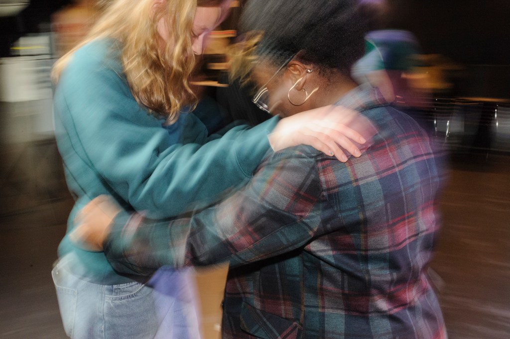 Hier komt naar mijn gevoel weinig interessants uit. Ik vind bijna alles wat ze nadien aanbrengen voor elkaar niet veel sterker. Ik voel hoe ik dat vaak niet kan verstoppen, ze voelen het aan me. Ik ben me ook constant bewust van het effect dat ik op hen heb. Aan de ene kan ergert het me dat ik die positie heb en ik me zo erg bewust word van mijn macht, aan de andere kant voel ik dat mijn inbreng ook nodig is om hen tot interessanter materiaal te bewegen. Soms vind ik wat ze zelf aanbrengen voor elkaar zelfs ronduit contraproductief omdat ze momenten als “sterk” of “mooi” benoemen die ik zelf veel minder interessant, sentimenteel of cliché vind. Ik moet me daar constant tot verhouden. Soms tracht ik dus bewust te verstoppen wat ik denk, door ergens niet op in te gaan of een nieuwe aanzet te doen voor iets anders, en soms laat ik het van mezelf toe dat ik duidelijker ben in het kenbaar maken van mijn eigen mening. Ik doe dat dan vaak aan de hand van een voorbeeld om iets te verduidelijken. Ik doe het enkel waar het nuttig zou kunnen zijn, omdat ik er iets in zijn algemeenheid mee kan zeggen over het theater (bijvoorbeeld als het over cliché’s gaat).