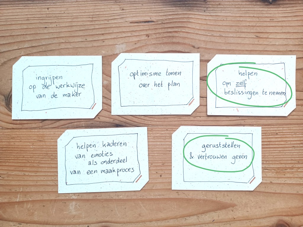 ‘Ik geef tijd om te ventileren. Niet oeverloos maar toch. Soms heeft dat gewoon te maken met de angst om te beginnen. Als ik dat merk, help ik ze over die angst heen door deadlines te stellen, verbonden met een opdracht: ‘Straks kom ik kijken en dan is dat en dat er.’ Ik zeg ook expliciet dat het niet af moet zijn. En ze moeten weten dat ik als ik iets maak, ik het ook niet weet en dat dat dus prima is. Dat dat erbij hoort. Het niet helemaal vinden hoort er dus ook gewoon bij. En dat is iets anders dan de boodschap geven dat het niet uitmaakt wat er uit het werkproces komt. Ze moeten er vol voor gaan.’