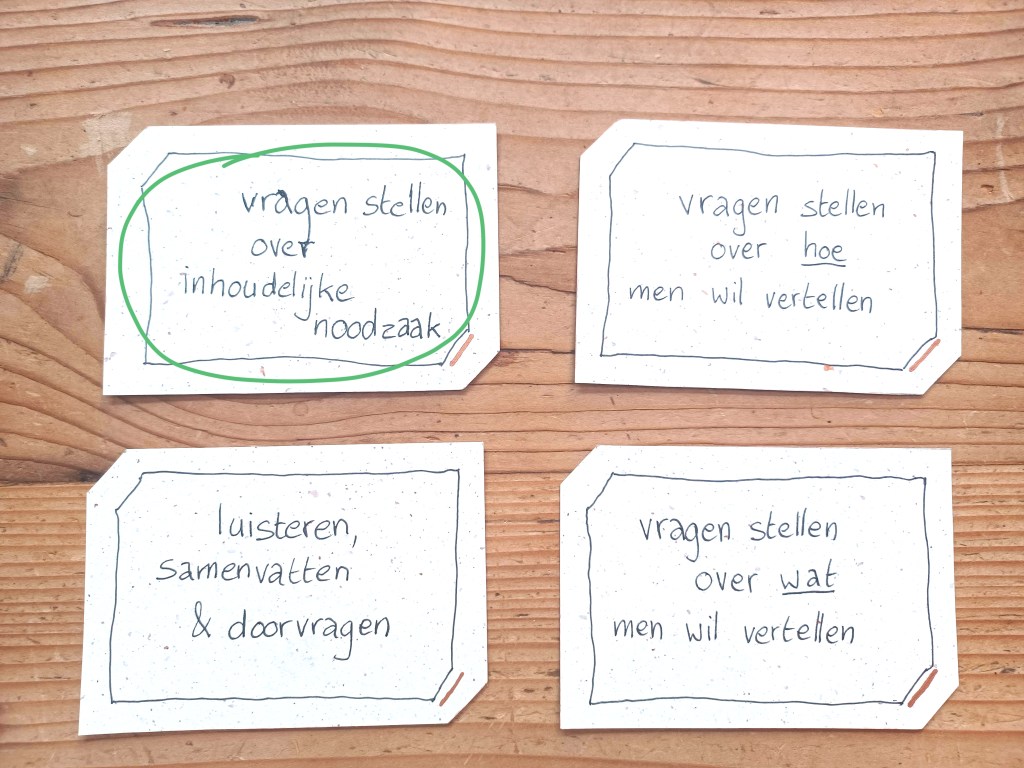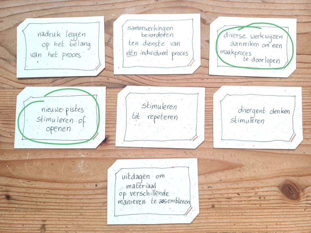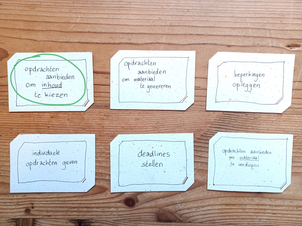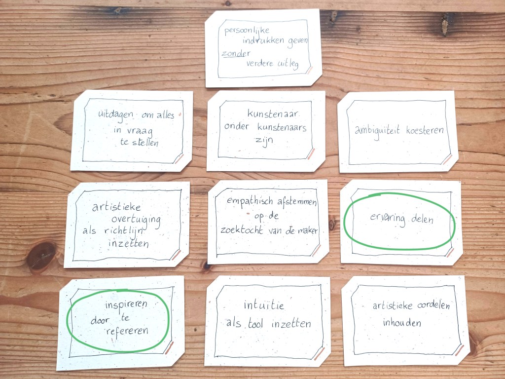 We leggen deze kaartjes voor aan theaterdocenten bij wie we gaan observeren en gaan erover in gesprek. Waar hechten ze belang aan? Waarom doen ze wat ze doen?