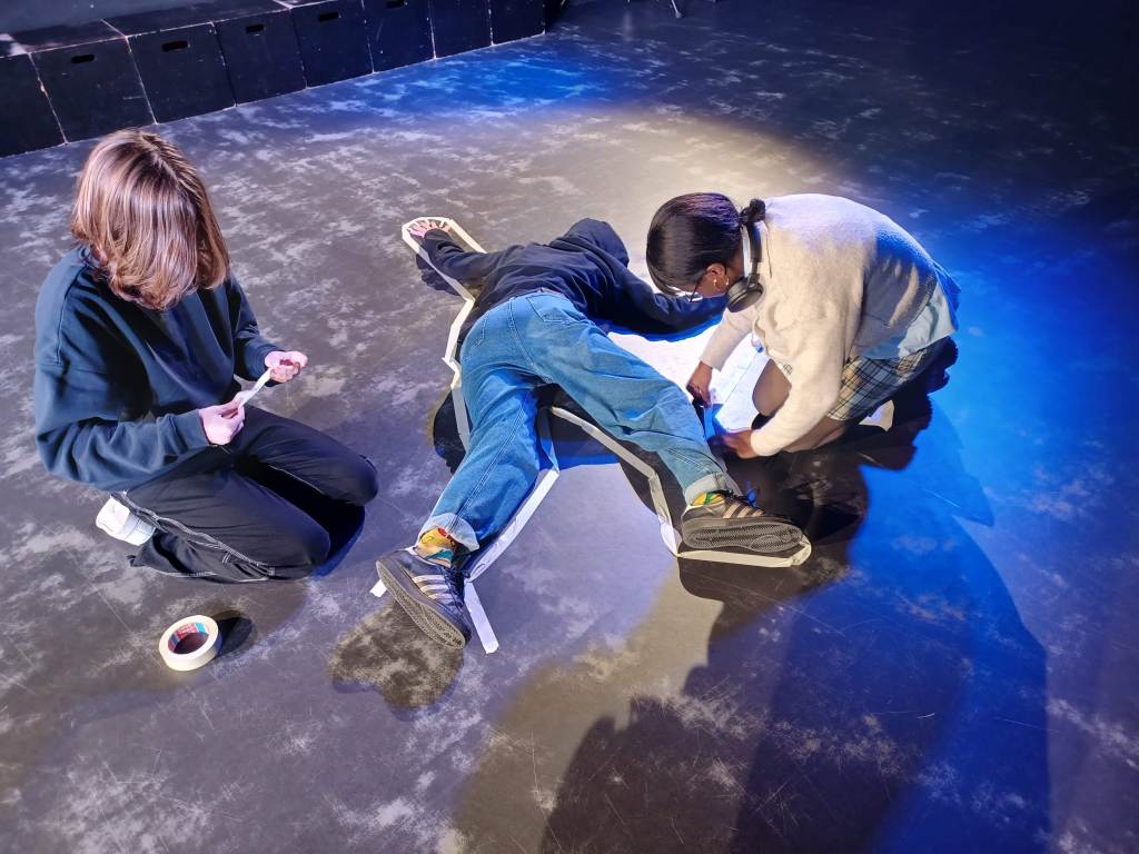 We tekenen de lijktekening op de vloer van de toneelklas. We zijn nu maar enkele lessen meer verwijderd van het toonmoment. Bij het begin van die laatste lessen zitten we in een kring en vertelt iedereen waar ze staan met de solo en waar ze nog hulp bij nodig hebben. Ook waar ze nog over twijfelen.