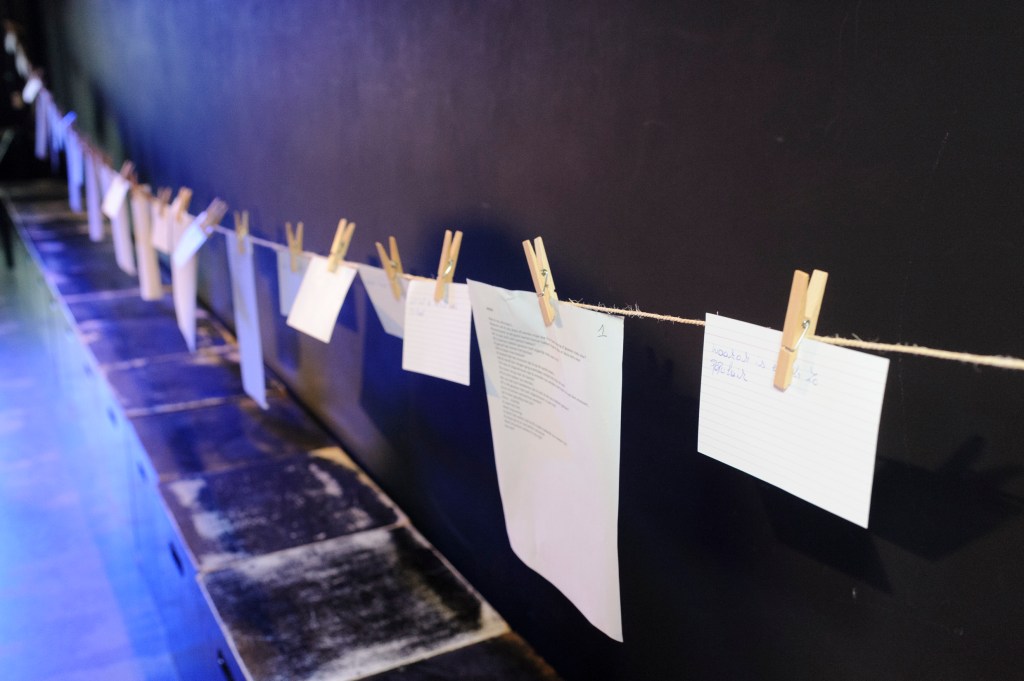 Uiteindelijk vraag ik hen om me op te sommen welke scènes ze willen behouden. We maken een overzicht. Thuis maak ik een mogelijke volgorde van het materiaal. Hun individuele momenten met hun solo-teksten geef ik ook een plaats in het geheel. De tijd dwingt me – denk ik – tot het maken van deze keuze. Er zijn maar twee lessen meer vooraleer ze hun toonmoment hebben. Maar het is ook mijn controledrang op het eindproduct die me drijft. Achteraf had ik deze oefening in compositie best nog aan hen kunnen overlaten. Ook de keuze van het beeld om alle monologen – die ze van mij niet meer van buiten moesten leren, enkel als ze daar tijd voor vonden – aan een waslijn te hangen achteraan het podium, komt van mij. Ik nam de tijd niet om hen tot een eventueel andere oplossing te laten komen en gebruikte alle tijd om hen het materiaal te laten herhalen en afwerken zodat het naar mijn aanvoelen voor een publiek kon gespeeld worden.