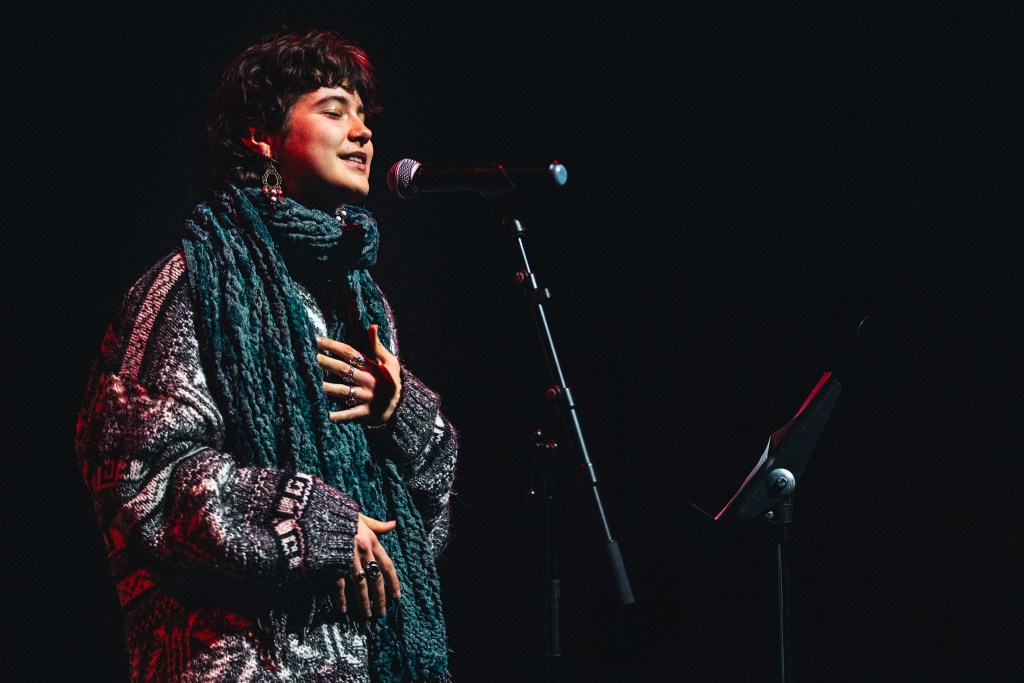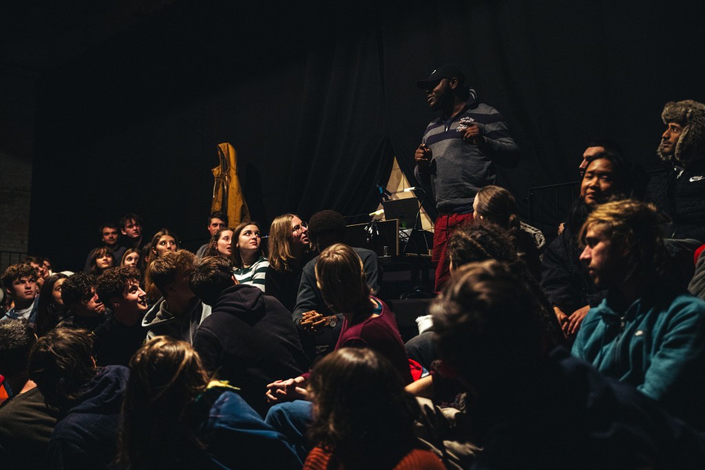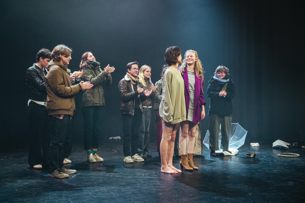 De zaal zit vanavond inderdaad bomvol jongeren en het enthousiasme om te zien wat er nu op de planken komt is voelbaar en zorgt voor een warm dekentje op deze eerste koude winteravond. Joachim Gys, artistiek medewerker bij LARF! leidt de avond in en vertelt wat we te zien zullen krijgen. Het belooft een volle avond te worden. Eerst is er de voorstelling van een podcast over rouw van Marie Schraepen waarin ze 5 jongeren interviewde die een dierbare verloren. In de komende jaren maken 4 jonge makers voor Larf! elk een podcastaflevering binnen het project ‘Nieuw Raar Europa’. Dit is de eerste. Inge Goddijn interviewt Marie op het podium en we krijgen een teaser te horen uit de podcast die in januari gelanceerd zal worden.