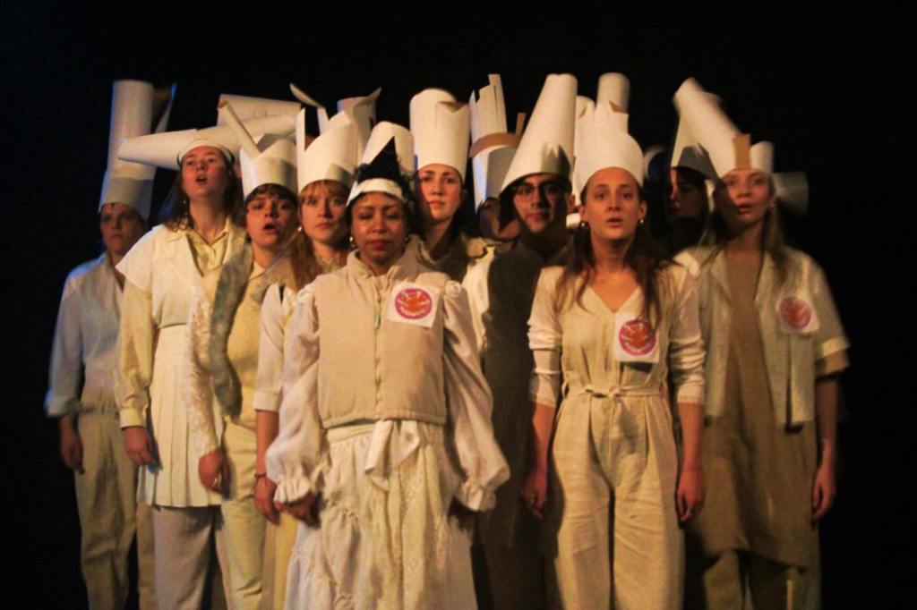 We zien deze avond vier presentaties die uiteenlopend zijn in vorm en in graad van afwerking. Eerst zien we ‘Koor Unie’: een theatraal koor met veel volk op de kleine scène van ‘Op de wolken’ in Gent. Een koor dat de grenzen opzoekt van wat je met een koor kan doen. Dan horen we een experiment met muziek, klank en zang. Horen want het is bedoeld om naar te luisteren, we luisteren samen naar een geluidsband, al dan niet met ogen dicht. Na een pauze zien we een dansperformance, geïnspireerd op een heksendans en als laatste zien we een presentatie waarin een man verliefd is op Scarlett, een rode telefoon.