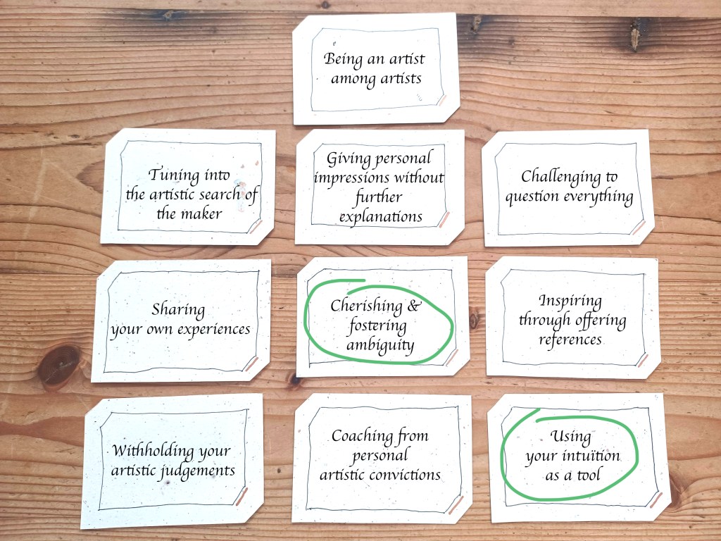 We present these cards to some of the teachers and artists we observe, engaging in conversations with them to understand their values and motivations. We seek to uncover why they engage in specific actions. Why are they doing what they are doing? For each theme we spotlight one answer to offer insights into the practices of artist-teachers.