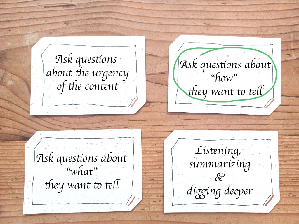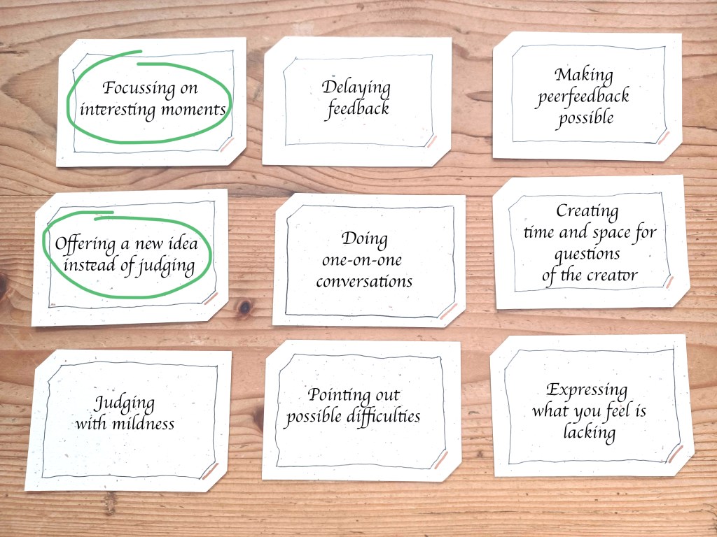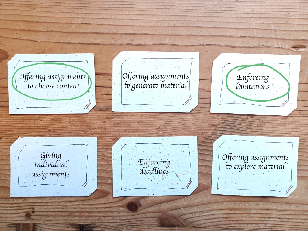 We observed several hours in various workplaces to understand how art teachers assist young individuals in creating their own works of art. Based on our observation reports, we distilled a set of actions performed by the instructors. Each action was documented on a card and organized under eight themes.