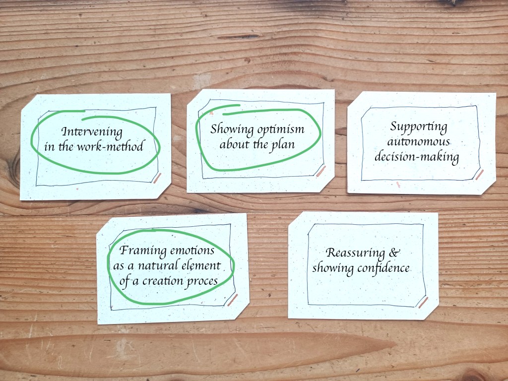 ‘Showing optimism about the plan is a good idea. A good atmosphere is important, the good vibe! You can only put people in a kind of tension very far in a process. When you already know the person very well and you know how you can provoke something. For example if you leave them all alone to work by themselves it can be very confronting. It can be very creative to have to make you own decisions, to be left alone and to defend what you want to do. You can be supportive by giving this freedom.’