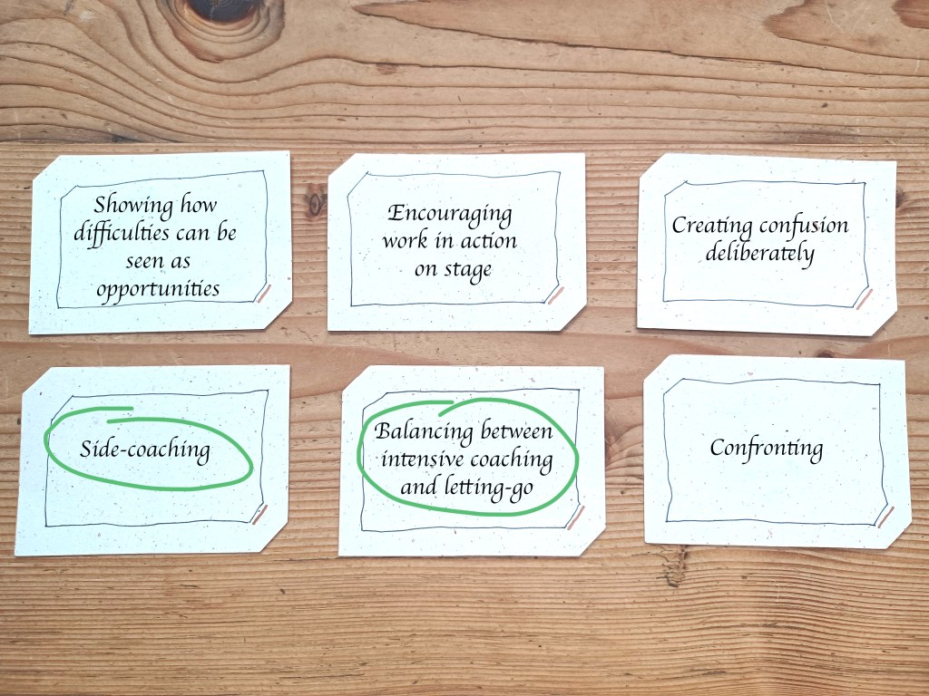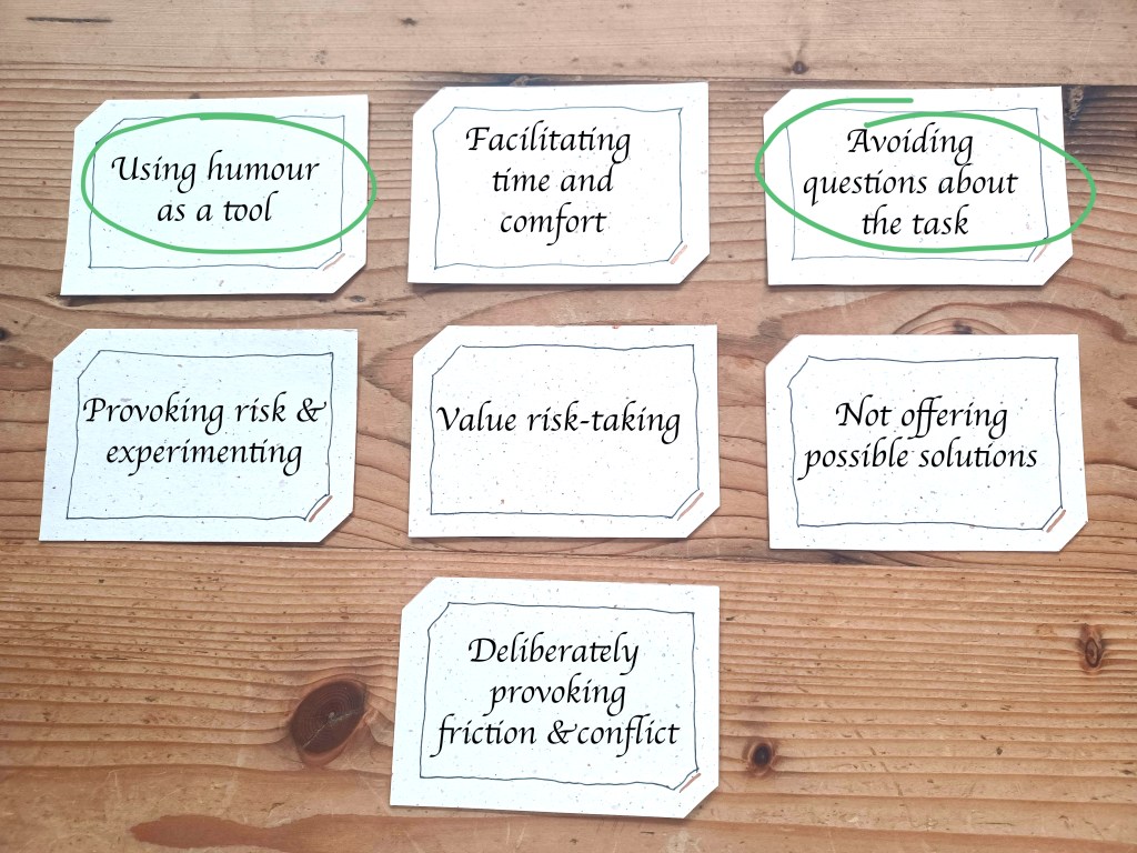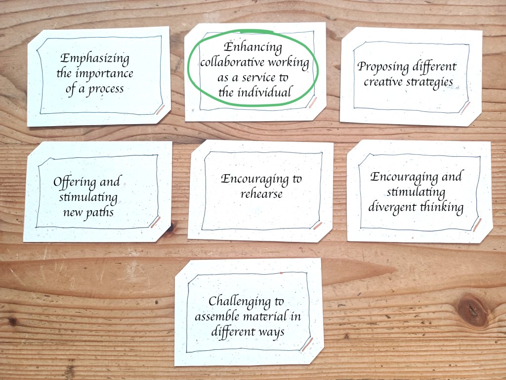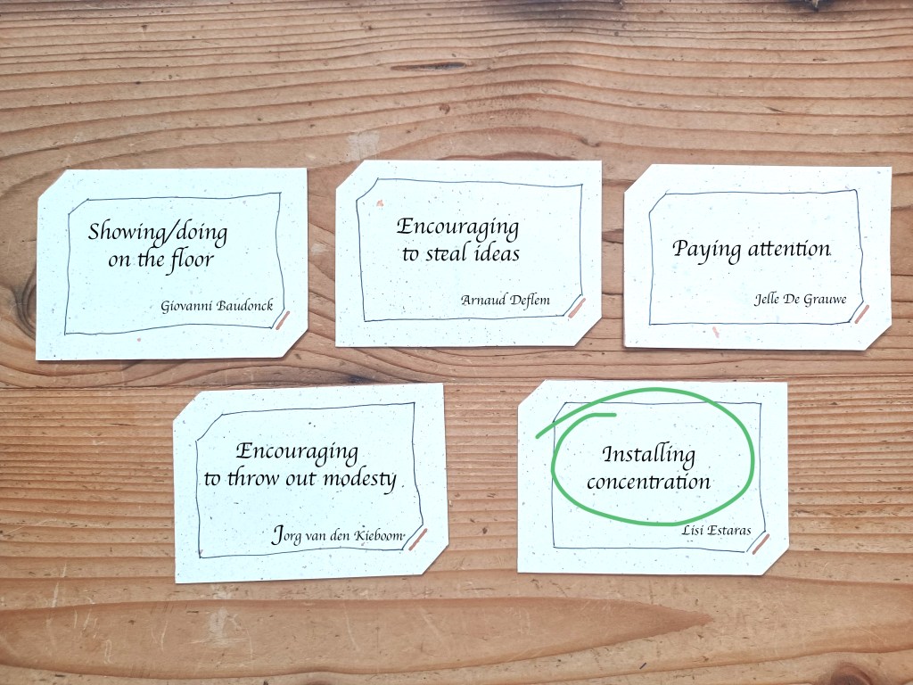 ‘I agree with all of the cards but it is not necessarily something I talk about, because I don’t talk a lot in a rehearsal. But for example enhancing collaborative working, I do it quite a lot. Because by pushing the other you’re helping them. For me it is fundamental: when you’re in service of the other this is not passive. It is quite the opposite: you’re very active because you’re pushing the other and it is not necessarily always with kindness or about being nice. By giving contrast you’re helping the other. For me creation is not only about your own bubble, for me the world has to come inside and this is a way to be both introspective and to be connected to the outside world. I like the awareness of this, because it gives tension. In a way you function always in relation to the group. It is never a solo act even if you are solo because other people are there watching. And even if they’re not watching, they are there. That’s why it is also so interesting to work with these diverse groups because everybody in the group is very different and so it opens a lot of creative modes of doing things.’