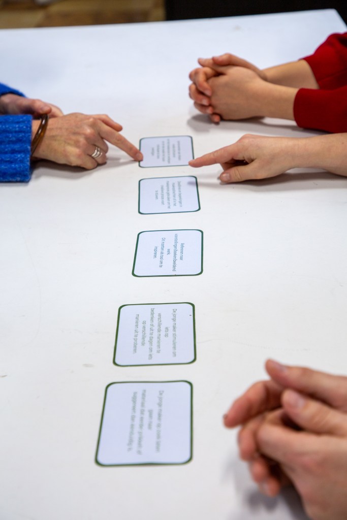 Soms kan je je helemaal niet verbinden met wat de jongere wil maken omdat het bijvoorbeeld helemaal niets is waar je zelf voeling mee hebt. Soms zelfs in een soort van spanningsveld waarbij je helemaal aan de andere kant staat qua inhoud bijvoorbeeld. Je gaat dan kijken waar je vanuit je expertise wél kan helpen. Ik gebruik daarvoor de termen ‘hands on’ en ‘hands off’ . In zo’n geval waarbij je ver van de inhoud staat, is het dan voor mij op dat vlak ‘hands off’ en ik zeg dan ook expliciet dat ik daar niet echt in mee kan of iets toe kan bijdragen. Maar bij de vorm word ik dan bijvoorbeeld heel erg ‘hands on’, want dat is iets waar ik erg goed in ben, wat mijn kracht is.
