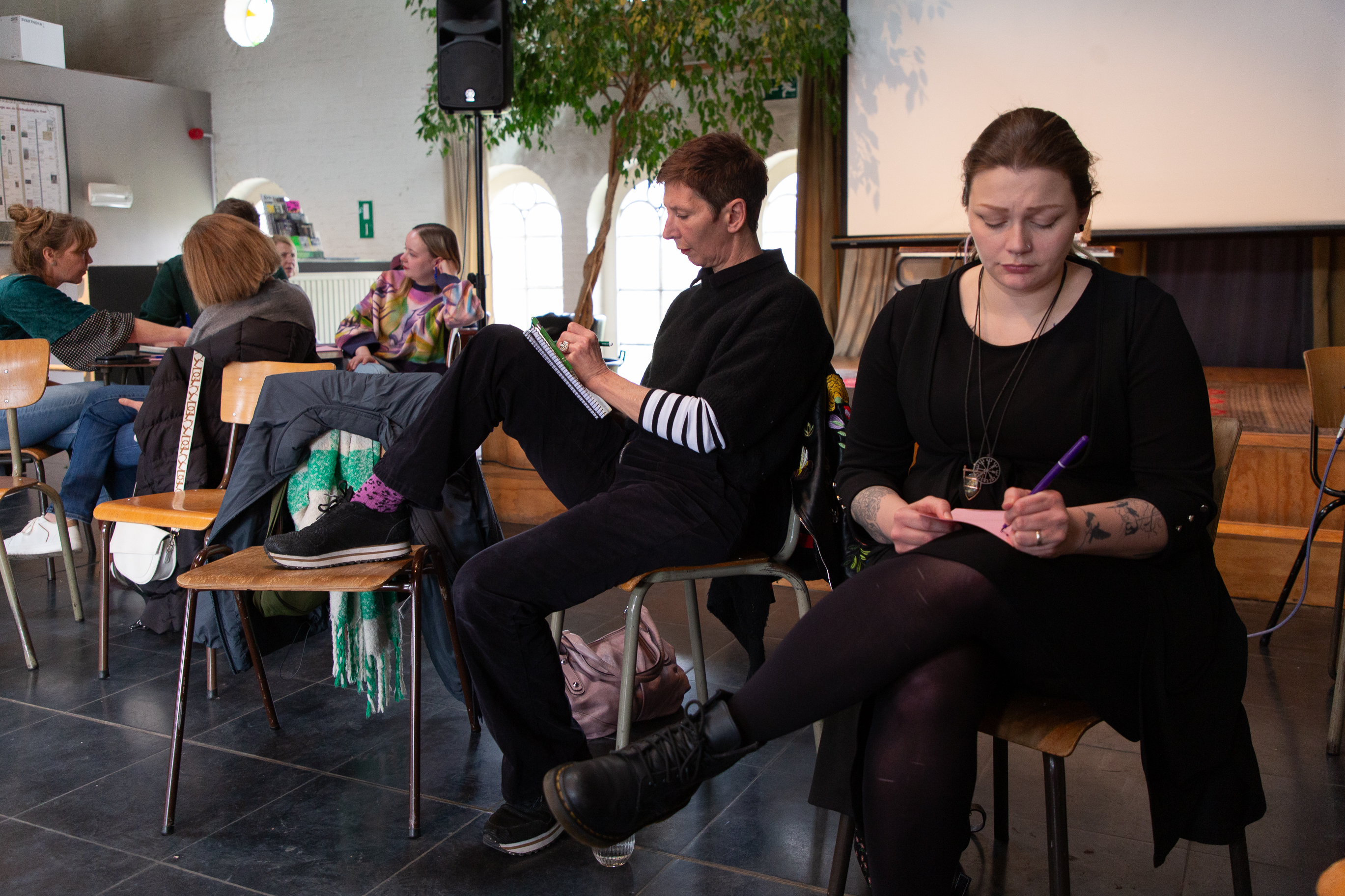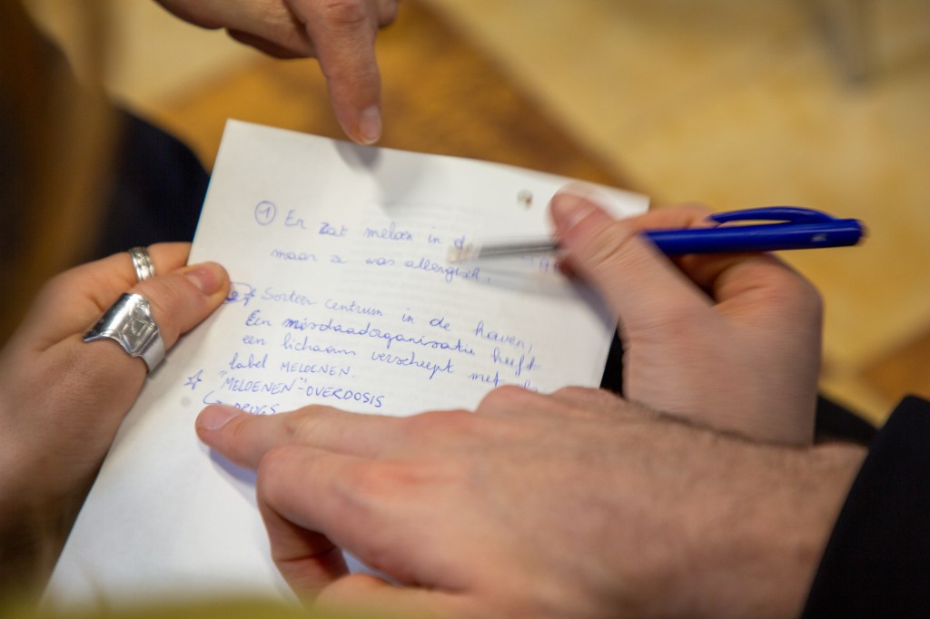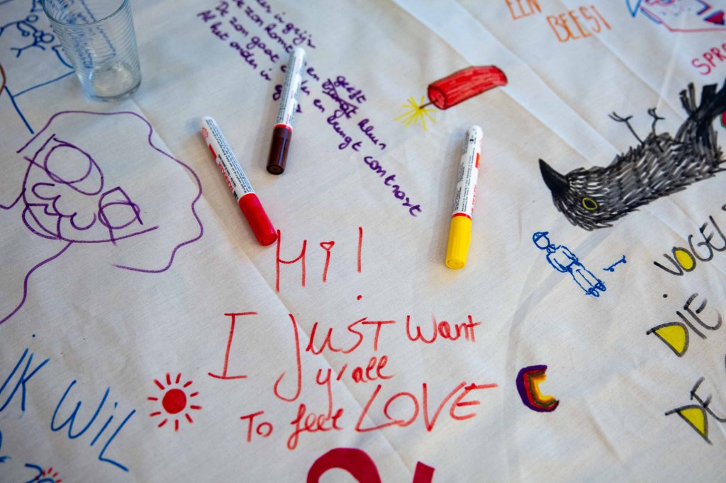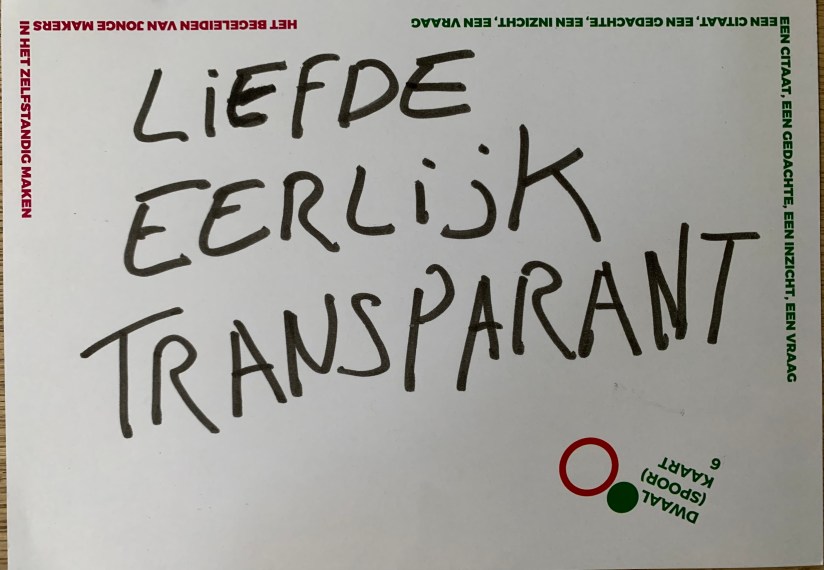 Even begon het wat aarzelend, maar algauw waren de stoelen steeds bezet en bleek acht minuten soms te kort om iedereen het woord te geven. Dus rinkelde het belletje soms ongenadig en kwam en er alweer een nieuw thema op tafel. Maar alles bleek uiteindelijk ergens toch samenhang te vertonen en niet los te zien van van elkaar. Het werd daardoor één lang en boeiend gesprek waarin vragen nieuwe vragen opwierpen, waarin tegenstrijdigheden een plaats kregen, waarin de complexiteit van dit werk aan de oppervlakte kwam én ook de hindernissen die opduiken in bepaalde contexten. Maar het ging ook over hoe we vaak hetzelfde ervaren, hoe we samen zoekend zijn om dit werk zo goed mogelijk te doen. En uiteindelijk ging het ook over de liefde, de liefde voor dit werk, voor de jongeren en voor de kunst.