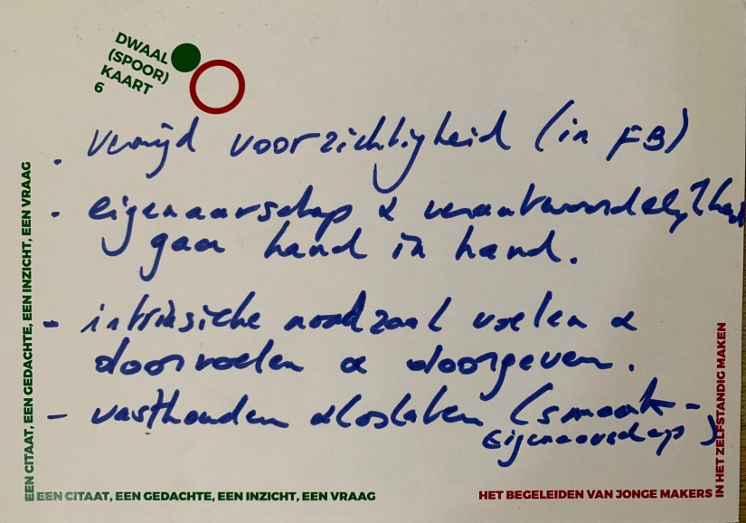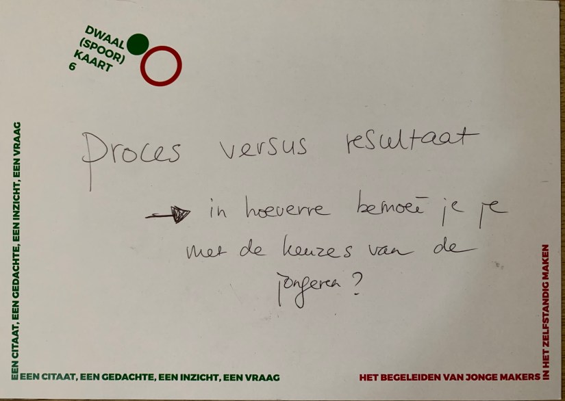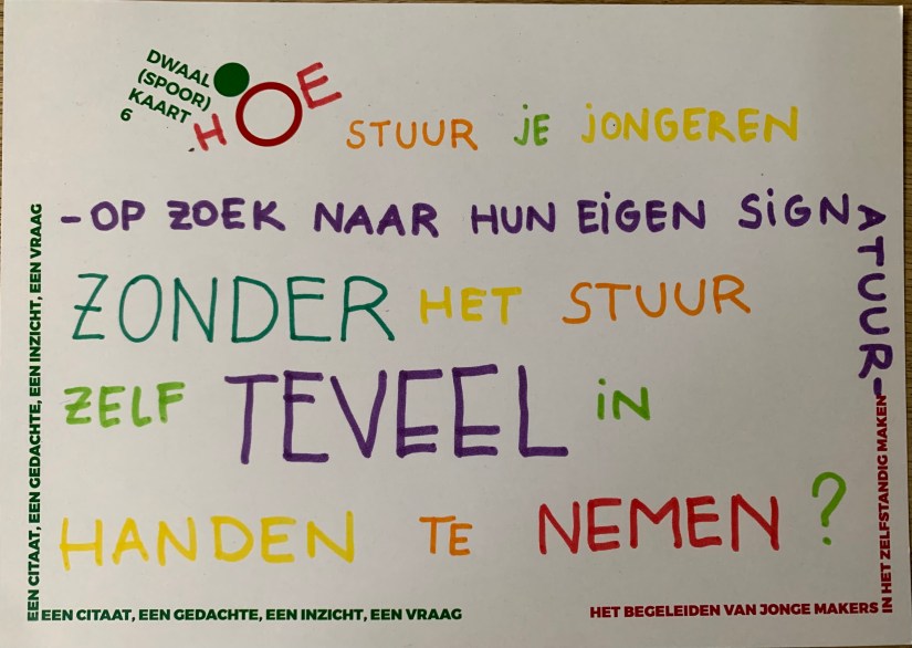 Soms is het inderdaad ‘kak’ wat je ziet, want zij proberen wel iets te maken, maar hebben nog weinig expertise in maken en modderen dan soms wat aan. Ik heb voor mezelf geleerd om strategieën te ontwikkelen waarbij ik hen een richting uitstuur zonder expliciet te zeggen wat ze moeten doen of het als een richting te benoemen. Ik ga dan bijvoorbeeld heel veel vragen stellen. En ook, ik geef ik dan soms voorbeelden, maar dan niet gewoon een paar, maar bij wijze van spreken wel 100 mogelijkheden of als je wil ‘100 smaken’. En ik geef ook opdrachten zodat ze aan de slag blijven.