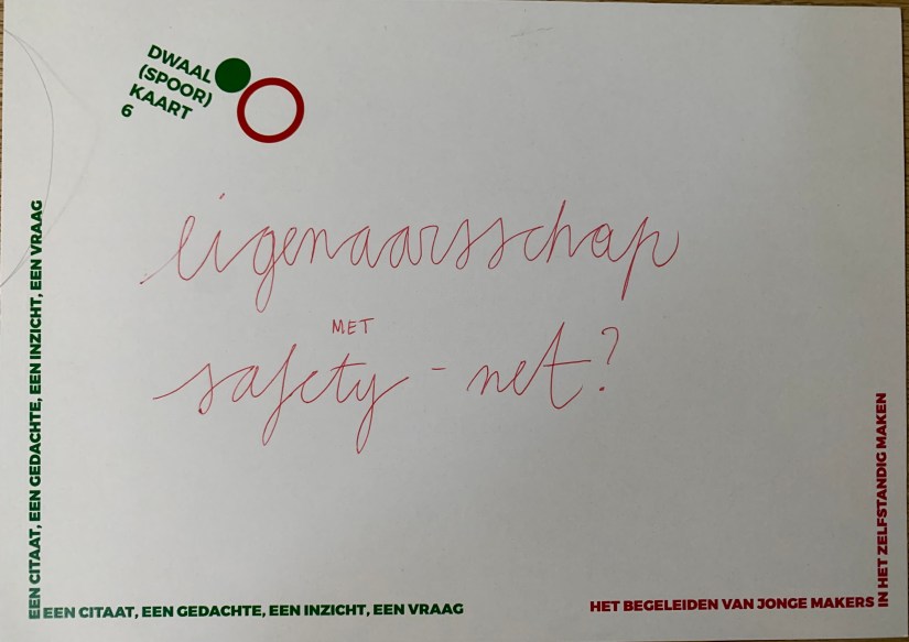 Meestal lukt het me wel om tijdens zo een proces de juiste vragen te stellen, te benoemen wat ik zie, wat het met me doet en erover door te vragen. Maar er komt dan altijd een punt waarop ik denk ‘ik kan dit nu beter niet zeggen’ en ik vind dat heel moeilijk, mijn handen ervan afhouden.