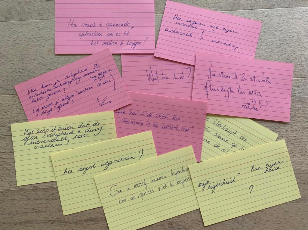 ‘Ik merkte in het begin van het creatieproces veel twijfel en schroom bij mijn groep. Zelf iets maken, gaat dat wel lukken? En dan nog alleen? In deze opdracht heb ik die twijfel tot inhoud gemaakt. Het was mooi om te zien hoe dat werkte voor hen. Twijfel werd door deze opdracht niet meer iets wat ze weg moesten steken maar iets wat mag bestaan. Ze gingen echt een drempel over: Je mag het niet weten, je kan het zelfs gebruiken als motor in een creatieproces. Sommigen wilden materiaal hieruit ook gebruiken in hun solo. Daar was ik achteraf niet altijd even gelukkig mee want het betekende dat de inhoud van sommige solo’s heel dicht bij henzelf bleef en ik vond dat niet altijd de meest interessante keuze. Hoe het liep vond ik wel mooi: hoe een opdracht die bedoeld om inzicht te krijgen in hoe een maakproces kan werken, voor sommigen ook echt bruikbaar materiaal oplevert voor hun solo.’